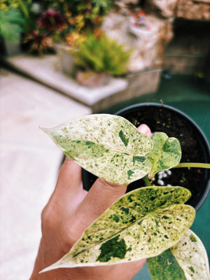 Variegated Alocasia Dragonscale Mint 4” potted house plant. Beautiful, stable variegation throughout the plant. The plant in photos is the actual plant you will receive. To keep this beauty happy you will want to provide very bright light, ample watering but allow soil to slightly dry out on top before rewatering and protect plant in temps under 60 degrees. Photos are of the actual plant for sale.