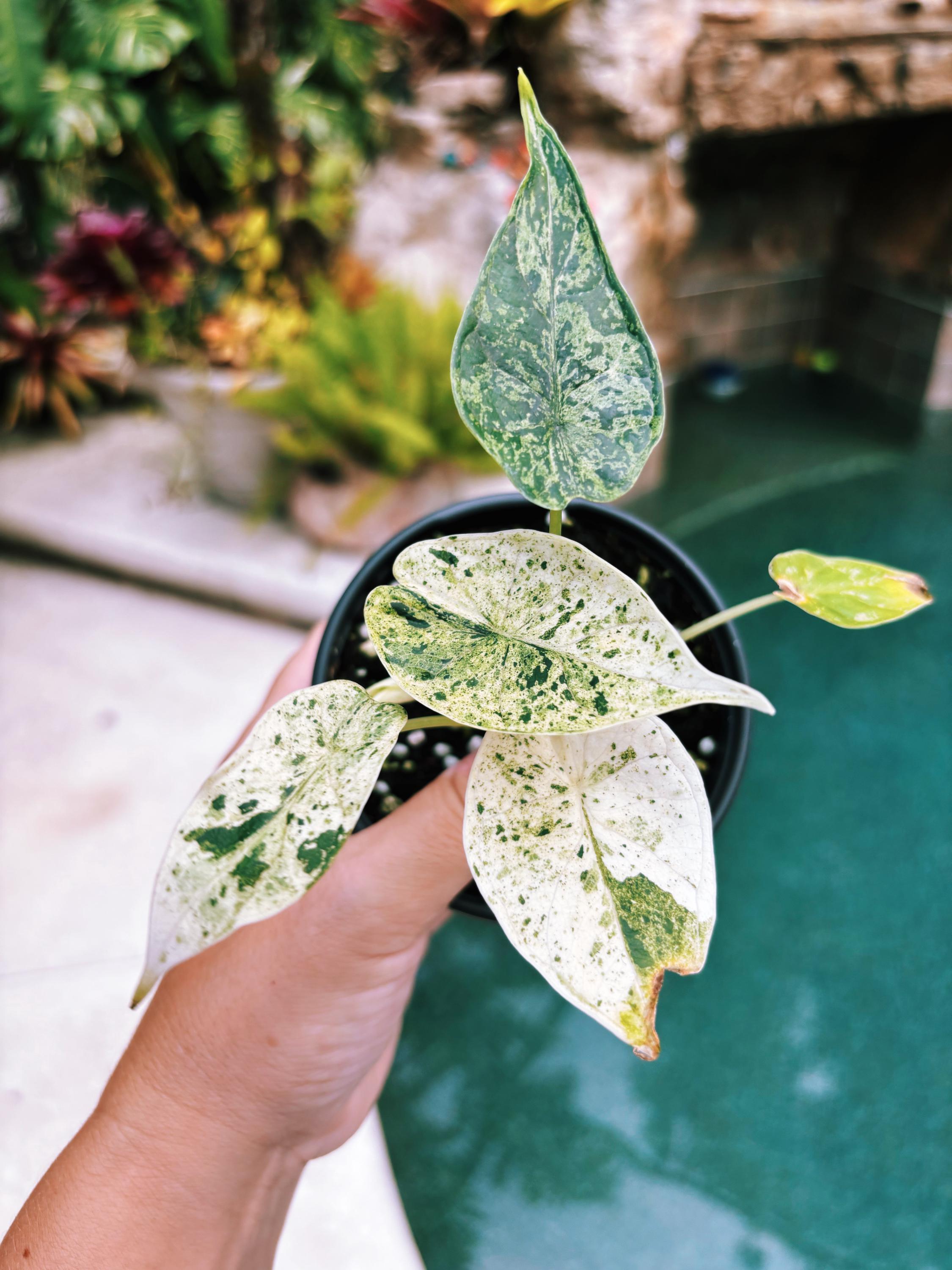 Variegated Alocasia Dragonscale Mint 4” potted house plant. Beautiful, stable variegation throughout the plant. The plant in photos is the actual plant you will receive. To keep this beauty happy you will want to provide very bright light, ample watering but allow soil to slightly dry out on top before rewatering and protect plant in temps under 60 degrees. Photos are of the actual plant for sale.
