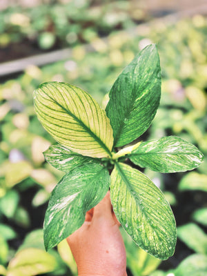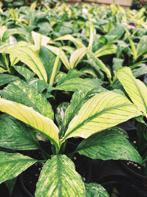 Variegated Spathiphyllum Sensation Mint live 4” potted plant. This is a growers choice listing where one will be selected from our stock for your order. This tropical makes a great house plant and will tolerate lower light but for best bright plant coloration grow in very bright light! Works very well under grow lights for optimum coloration.